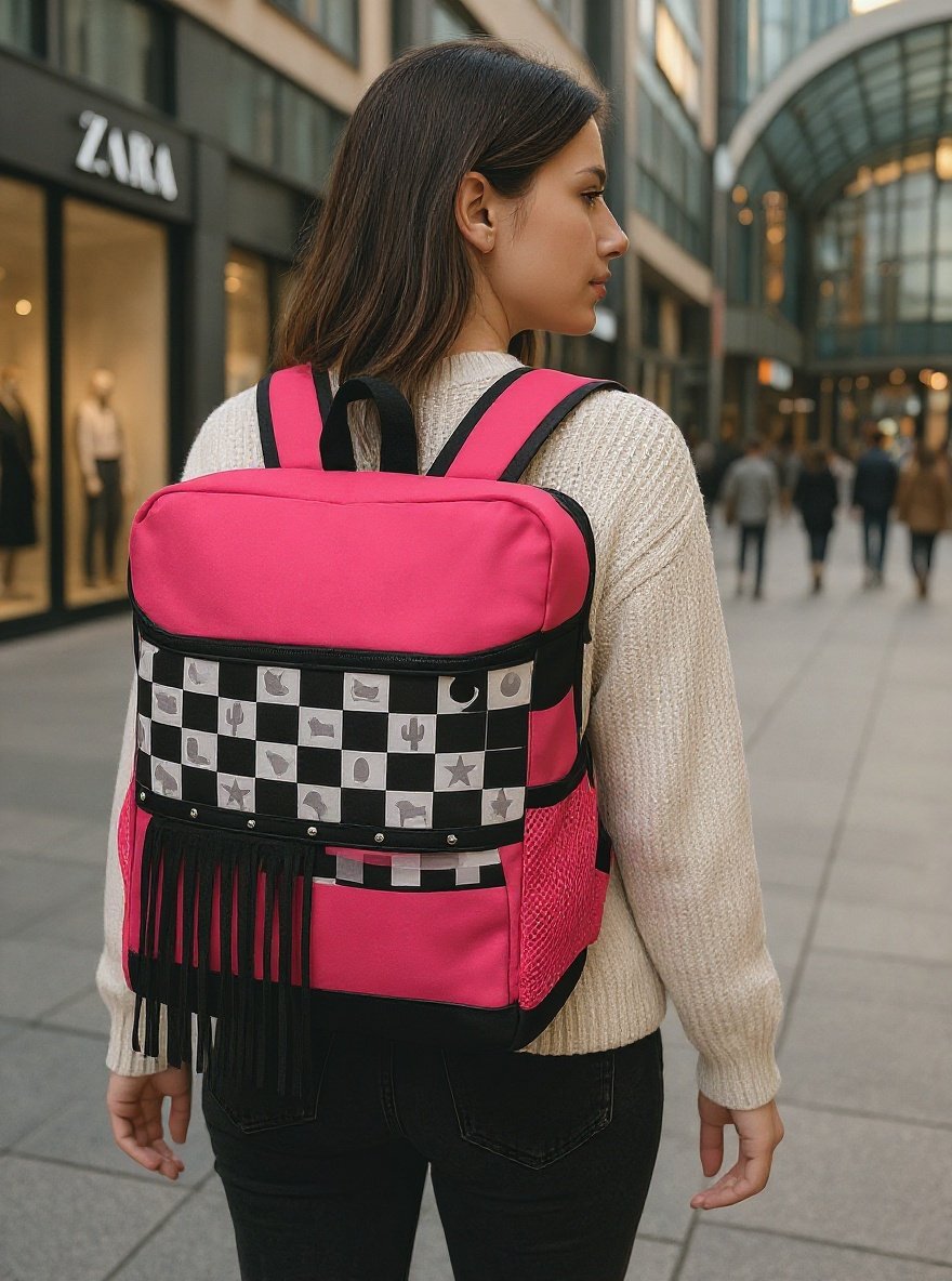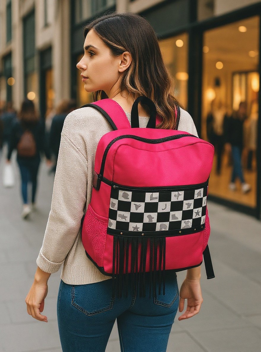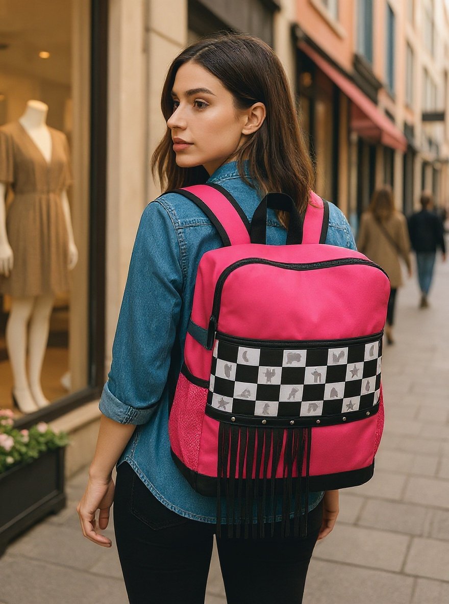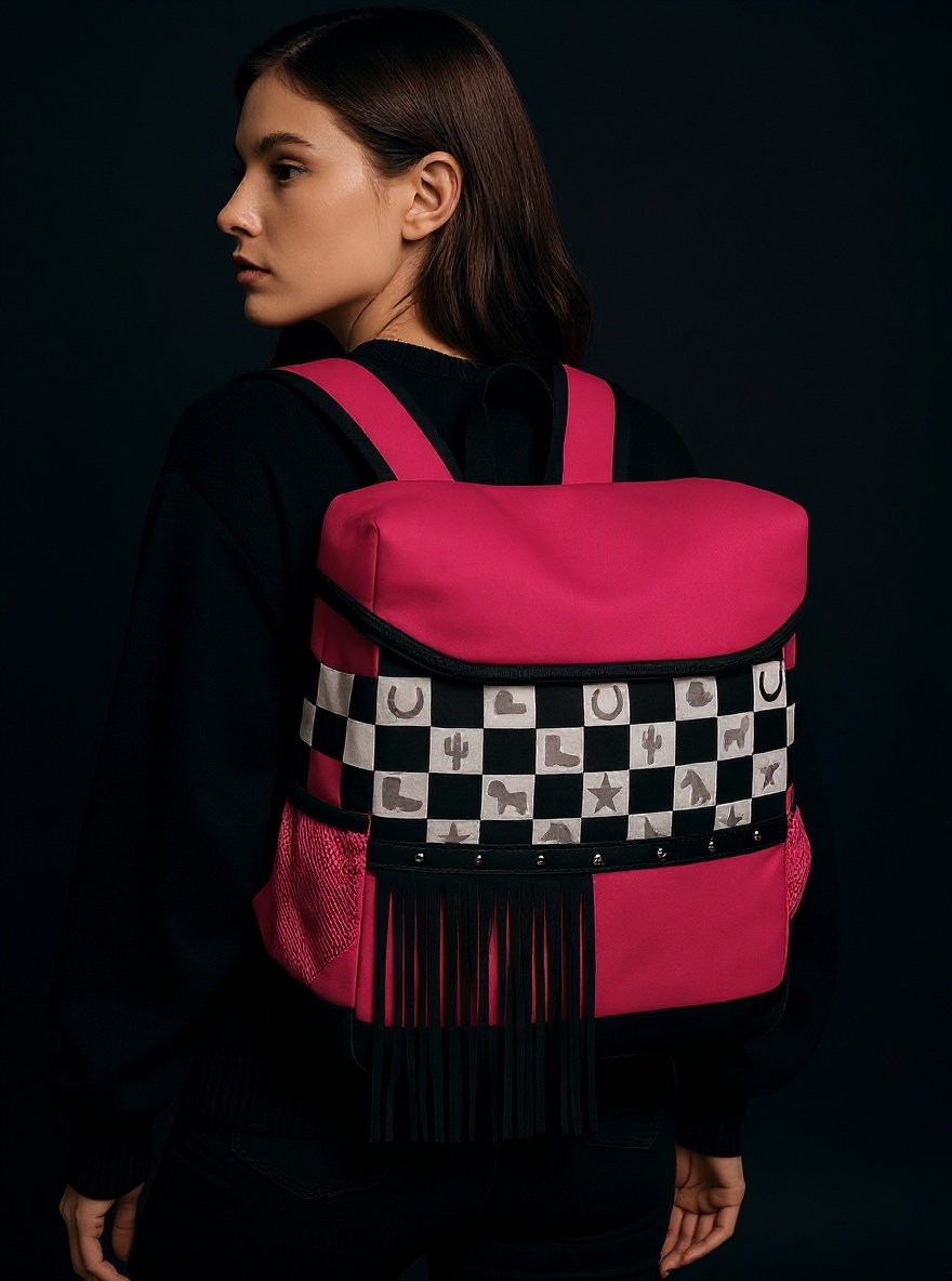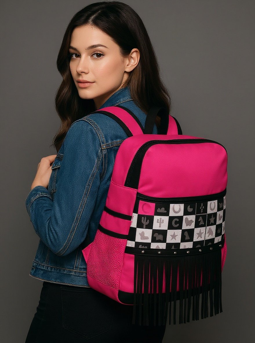 Function meets western-inspired fashion with the Hot Pink Fringe Backpack Cooler from Mae Bulls Boutique. This bold pink backpack features a checker-pattern front panel with western motifs, accented by classic black fringe trim. Designed not only for style, this backpack doubles as an insulated cooler, perfect for keeping beverages and snacks fresh on the go. Its side mesh pockets and zippered compartments provide additional storage for functionality.