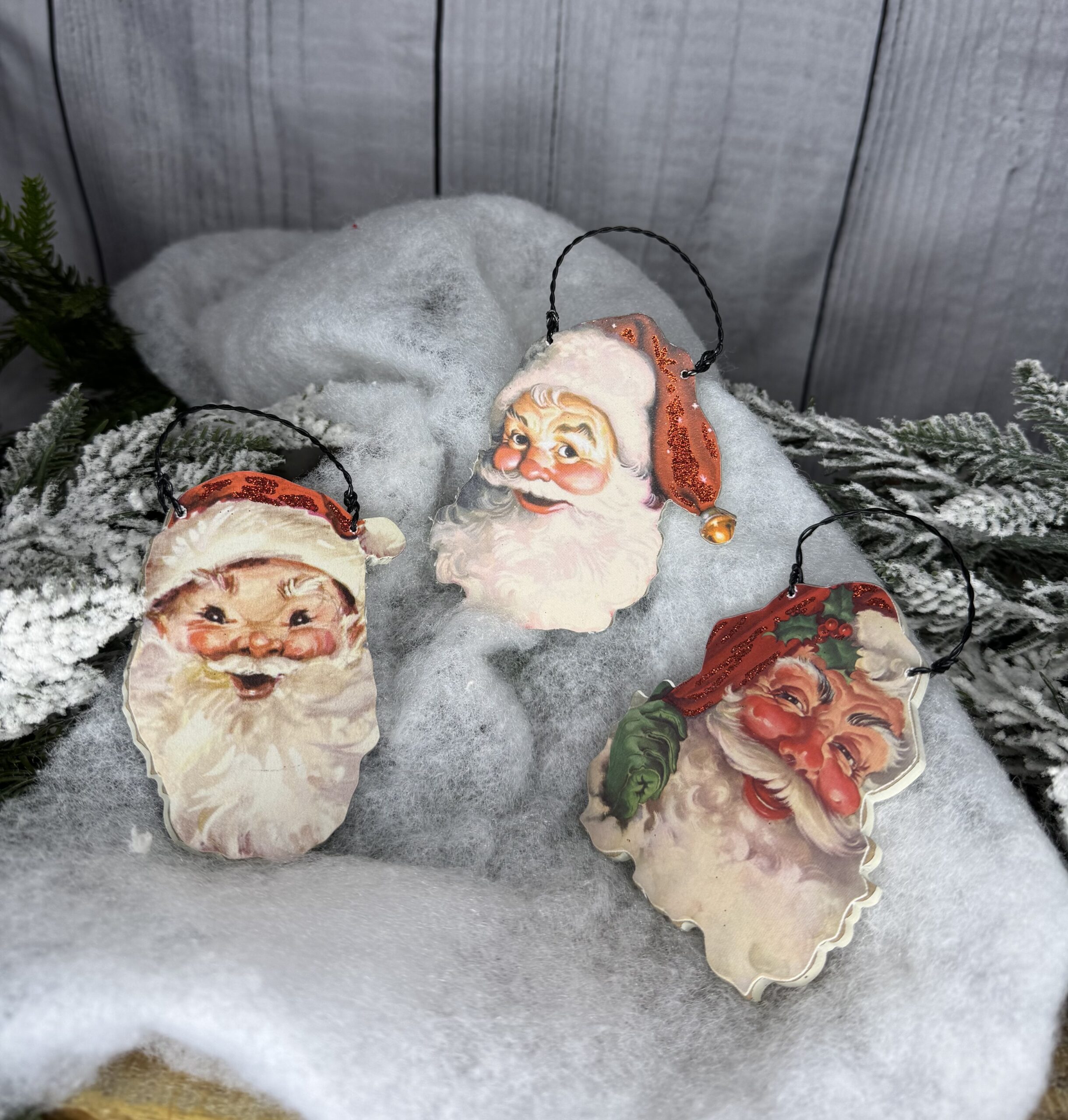 A set of three wood decorative ornaments featuring wooden cutouts of Santa faces in a vintage art style with glitter accents. Each ornament includes individual designs and coordinating white color on the sides and backs. Easily display using attached twisted wire hangers. The Santa Claus ornament set comes packaged together in a poly bag tied with red ribbon. A vintage-inspired set of seasonal home accents with a variety of display options.