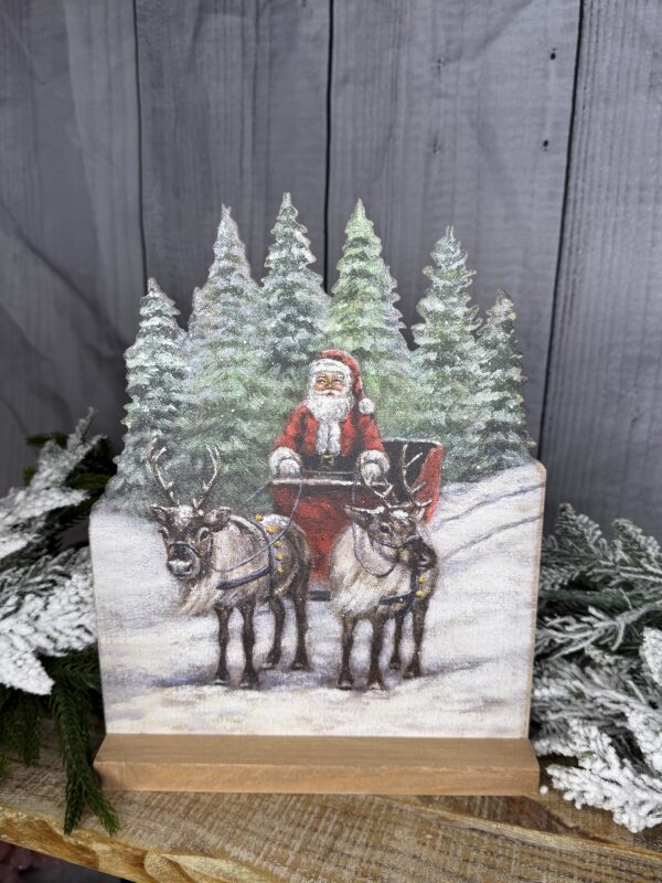 A wooden stand up décor piece (10.5inchea tall) displaying a cutout design and hand painted scene of Santa standing in a sleigh. Design is double-sided to easily view art on either side and is placed in a natural wood base. Our Santa’s Sleigh stand up can free-stand on any flat surface. A rustic seasonal home accent with a variety of display options.