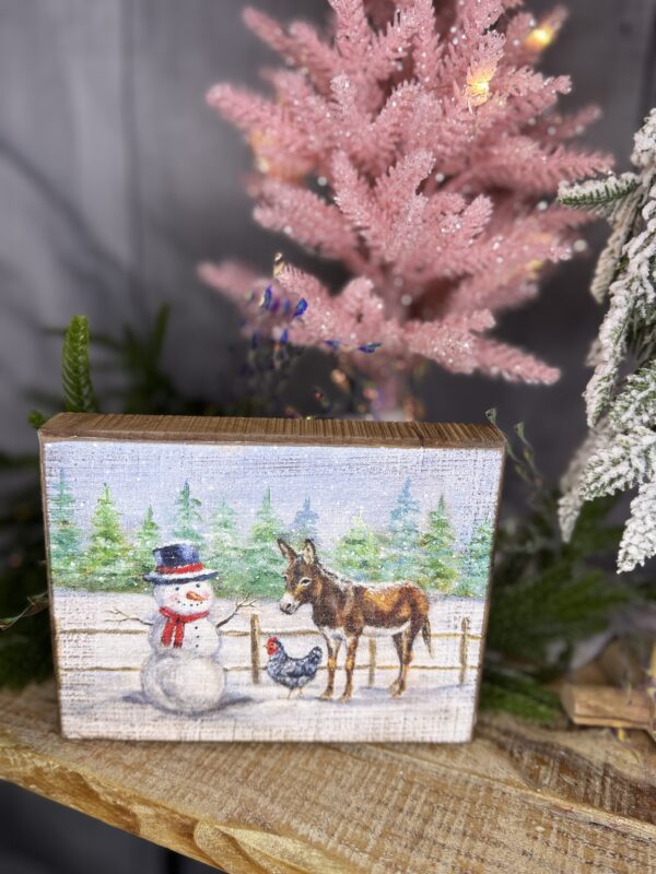 & Free ShippingA wooden block sign(6.5inches long and 5 inches tall x 1 inch wide) from displaying a calming hand painted scene of a snowman with a donkey and a chicken in the snow.