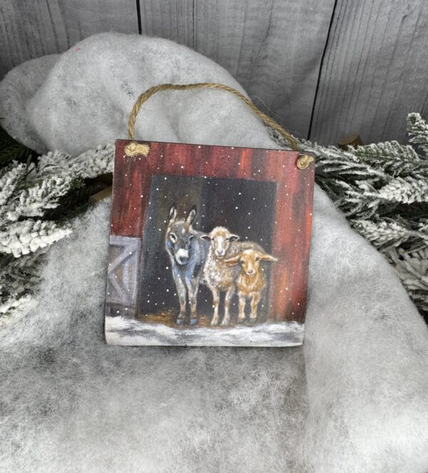 A wooden ornament(4inches x 4 inches) featuring a red barn and farm animal design. Design is painted onto burlap canvas, giving the art a unique depth and texture. Hangs easily by jute loop.