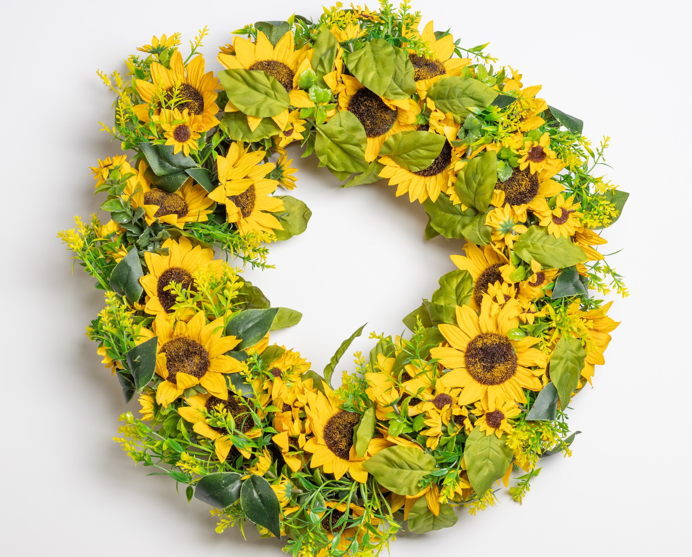 Bring sunshine into your home with the Sunflower and Greenery Wreath from Mae Bulls Boutique. This lush wreath is bursting with realistic sunflowers and filled with vibrant greenery, capturing the essence of a sunny summer day.