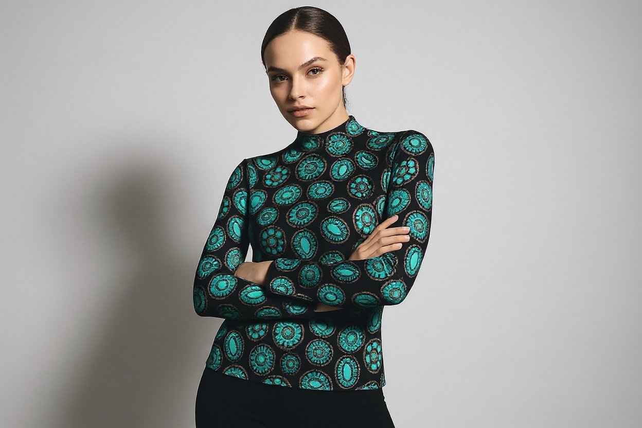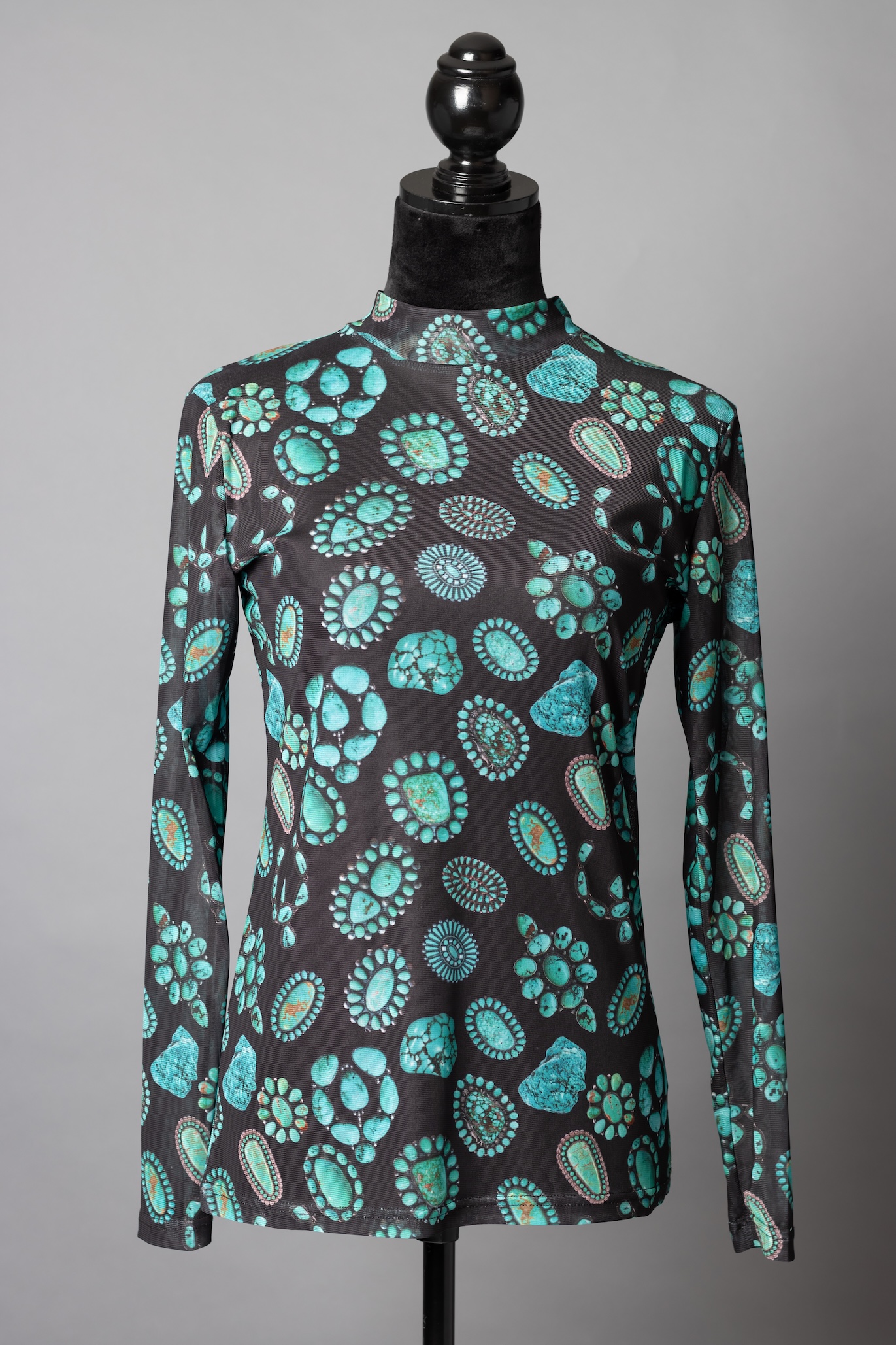 Celebrate bold patterns with the Turquoise Gemstone Long Sleeve Top from Mae Bulls Boutique. Covered in turquoise-styled gemstone graphics against a black base, this fitted long sleeve makes a striking impression. Its unique motif combines nature’s beauty with fashion-forward flair, creating a wearable art piece perfect for those who love to stand out.