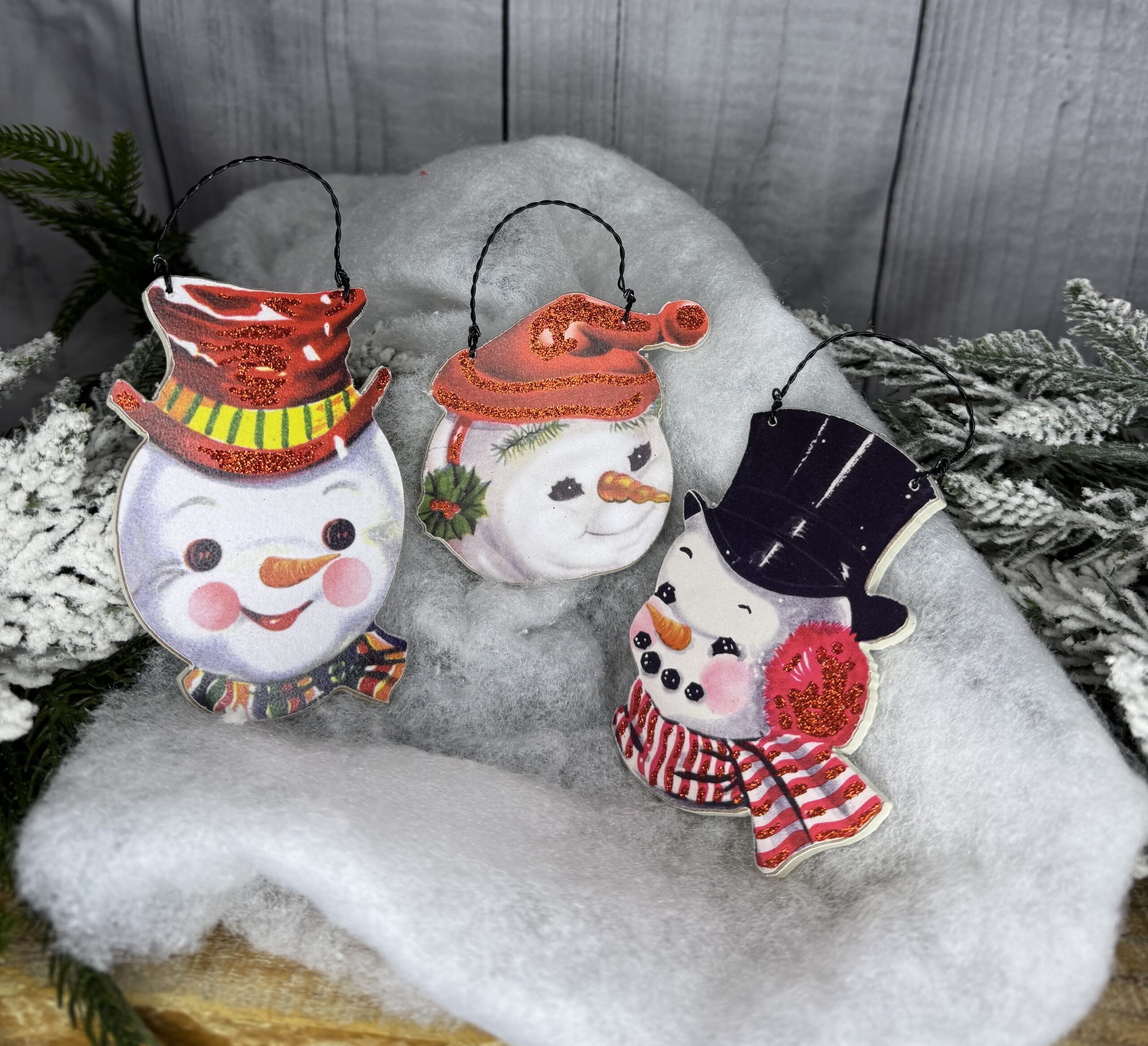 & Free ShippingA set of three decorative wood ornaments featuring wooden cutouts of snowman faces in a vintage art style with glitter accents.