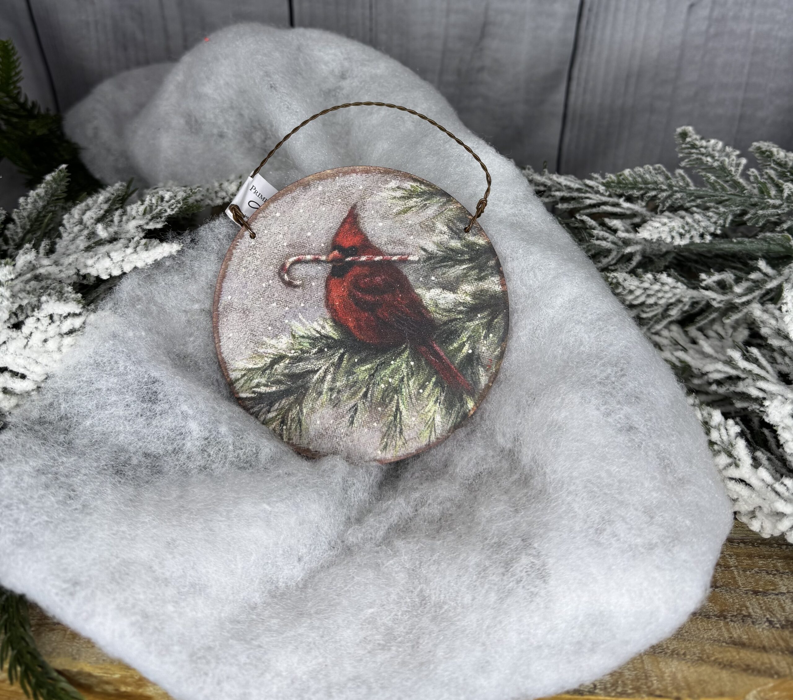 A round wooden ornament (4inches tall) displaying a charming winter scene of a cardinal. Design is painted onto burlap canvas, giving the art a unique depth and texture. Seasonal ornament features distressed details with coordinating red color on the sides and back. Our Winter Cardinal ornament is easy to hang for display via attached twisted wire hanger. A rustic winter-themed ornament perfect for seasonal display.